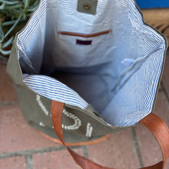 The bag has leather shoulder straps and the round base is trimmed with leather edging. The interior is fully lined with 100% cotton and has a magnetic closure. It has a small open pocket for those things you want at hand.