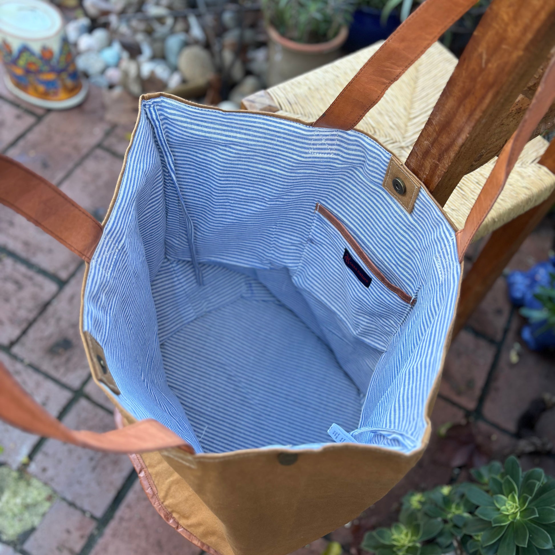The bag has leather shoulder straps and the round base is trimmed with leather edging. The interior is fully lined with 100% cotton and has a magnetic closure. It has a small open pocket for those things you want at hand.