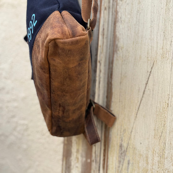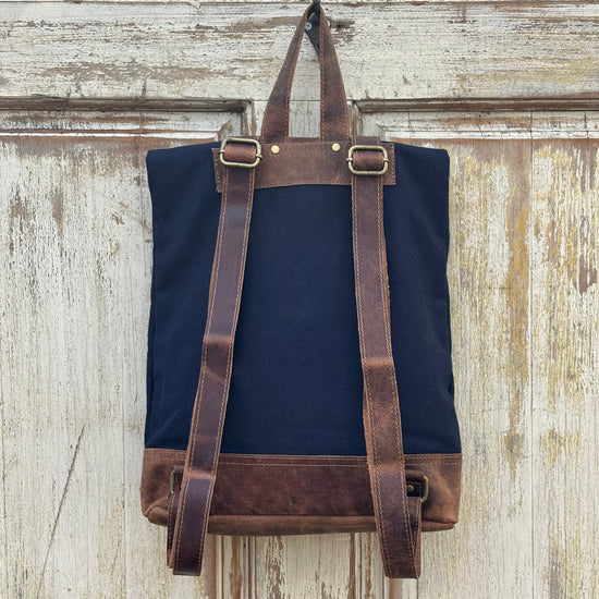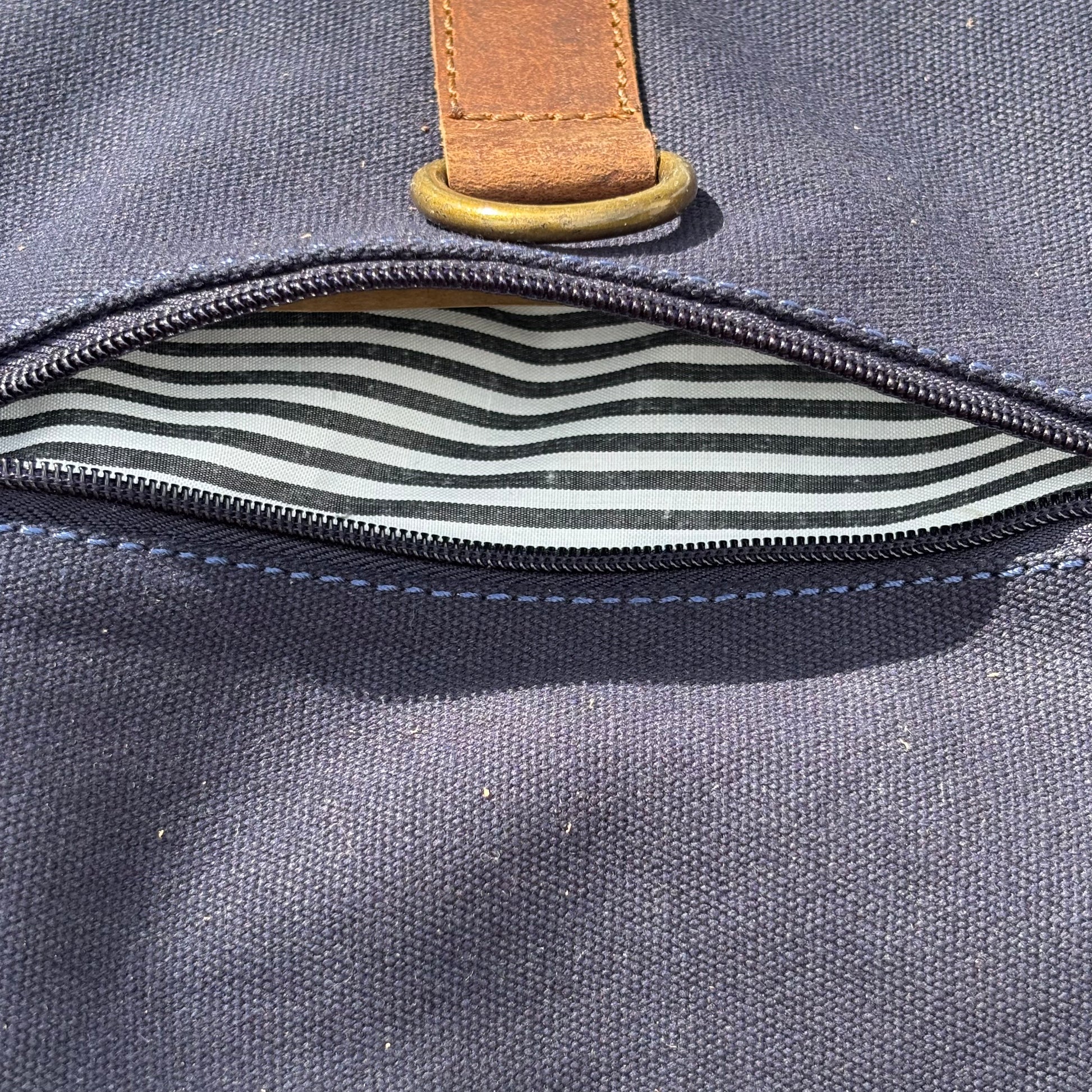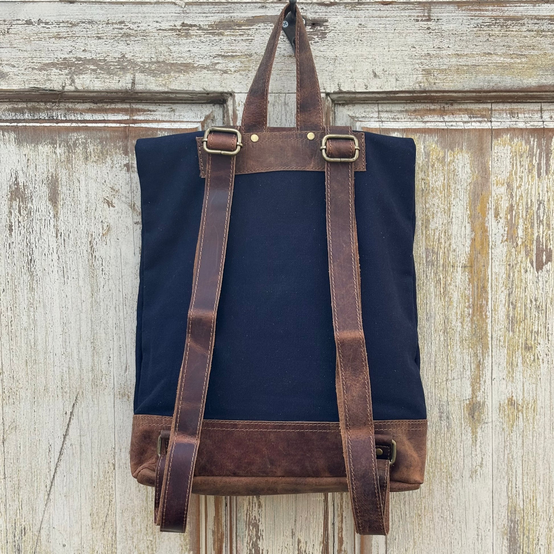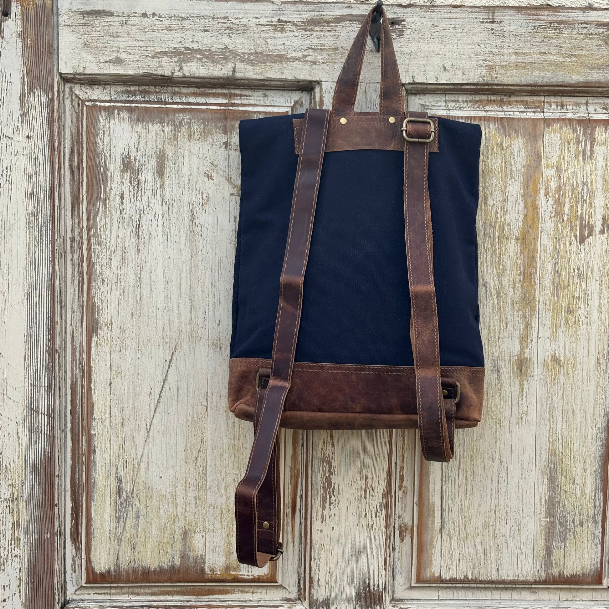 This backpack is part of our luxury line. Beautifully crafted from new canvass and high-quality leather, it makes for a great day pack. The base is leather contrasting stylishly with the canvass. The backpack features soft leather adjustable straps for comfort and a leather handle for carrying or hanging. The front has a zipped pocket and metal closing clip. Inside is fully lined with 100% cotton lining with a zip pocket.
