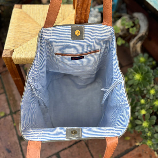 This bag has leather shoulder straps and the round base is trimmed with leather edging. The interior is fully lined with 100% cotton and has a magnetic closure. It has a small open pocket for those things you want at hand.