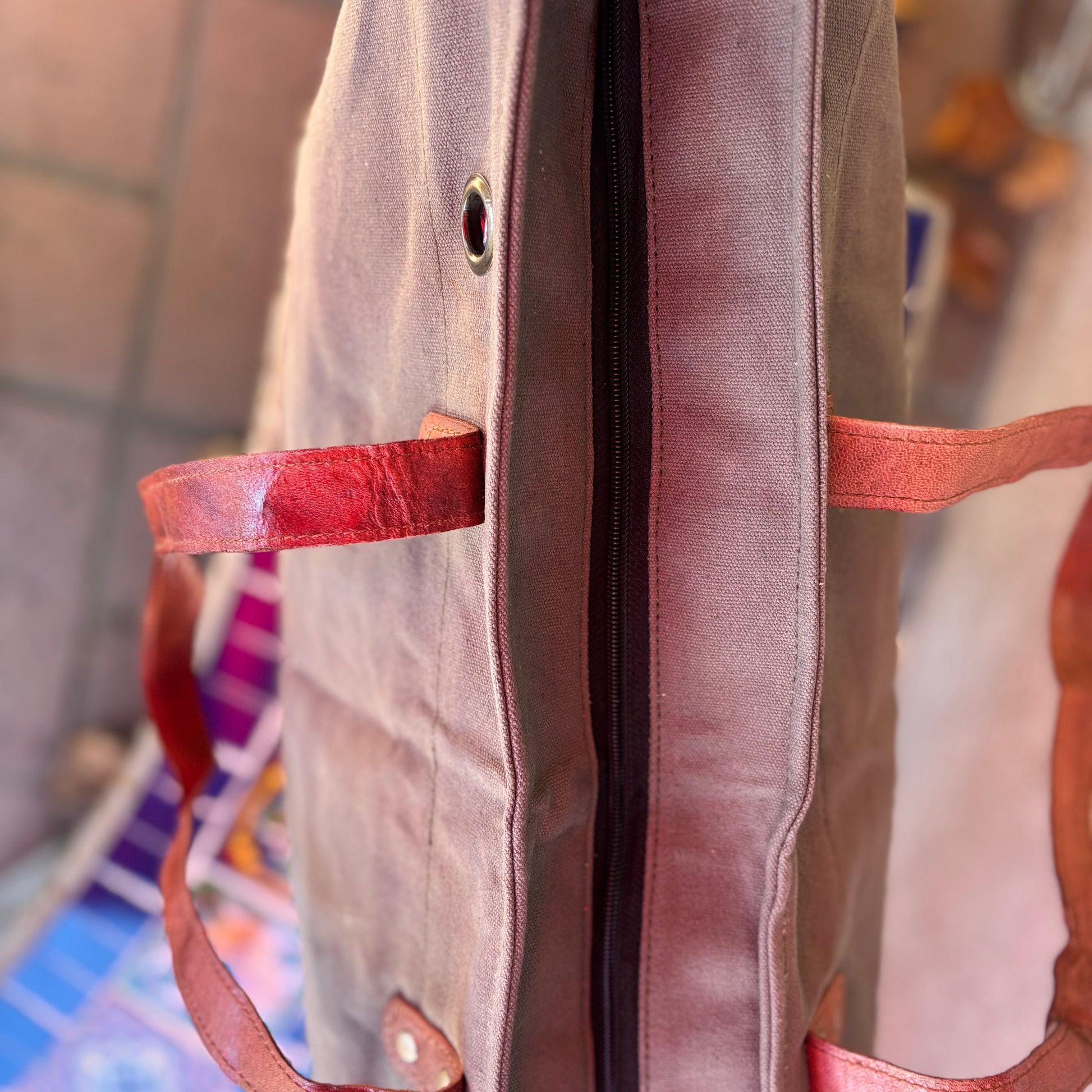 This vintage washed canvas fabric bag is a perfect choice for those looking for a casual yet sophisticated style. Skylar is a rectangle multi- purpose bag featuring zip closure, leather handlers and corners on the base. The bag is lined with 100% cotton lining.