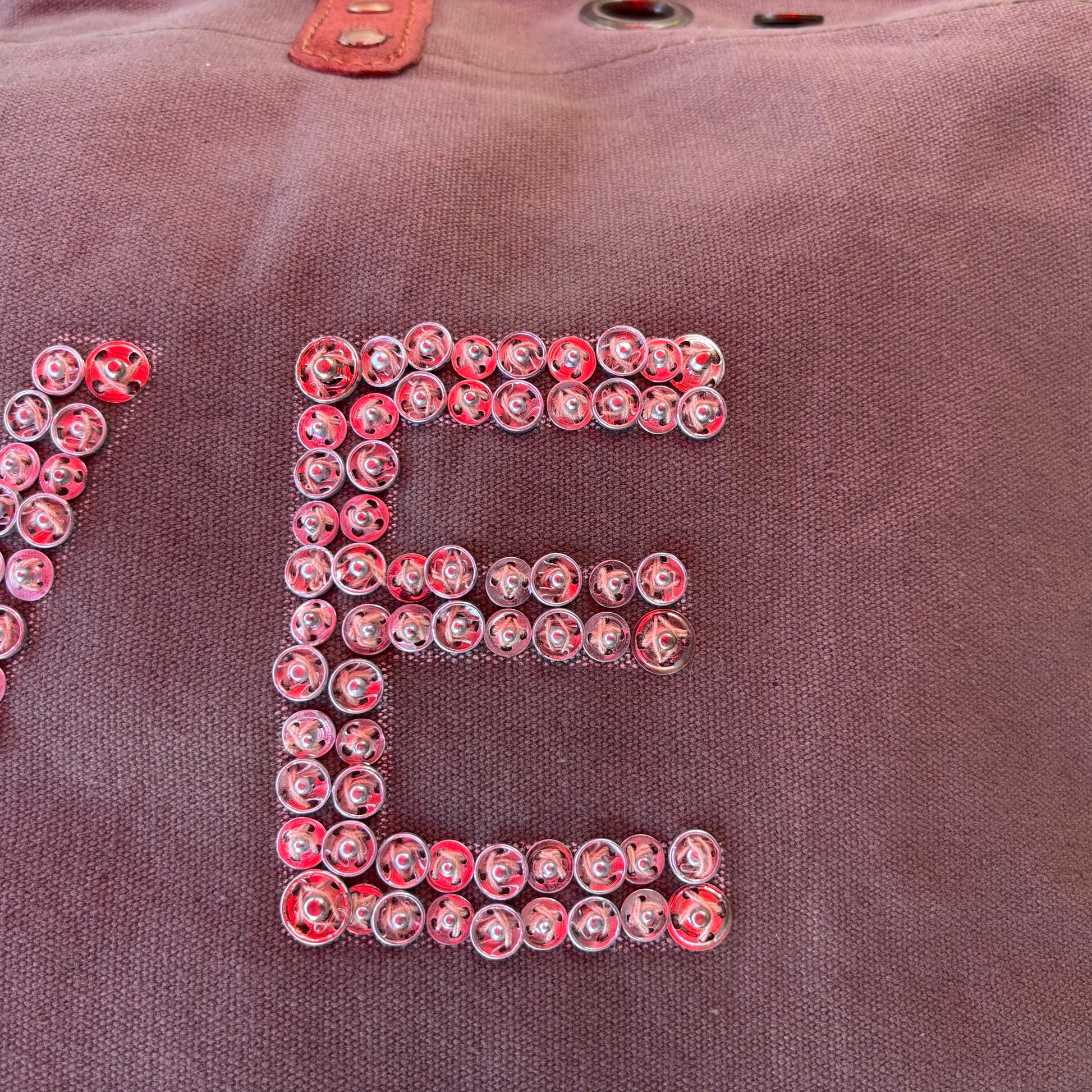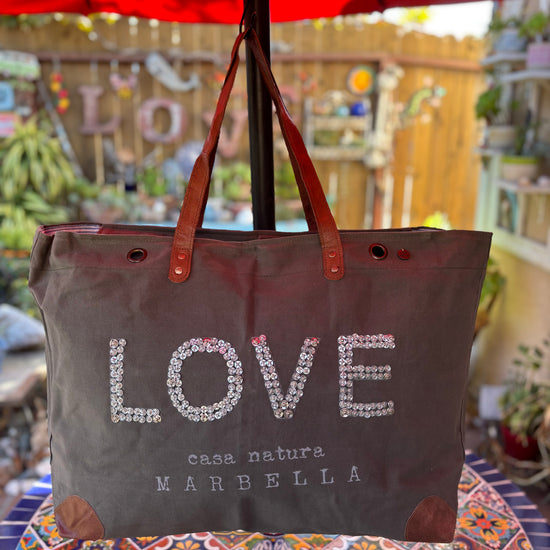 The word LOVE is crafted on the front of the bag. Each letter is created using hand sewn snaps. Our customers really appreciate this level of detail and unique design. With the hand stitching each bag has its own distant character and personality.